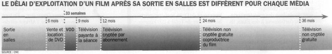 Or, la VOD change la donne. Les FAI souhaitent une disponibilité rapide après la sortie en salle. Mais après négociations en 2005 le délai est de 33 semaines.