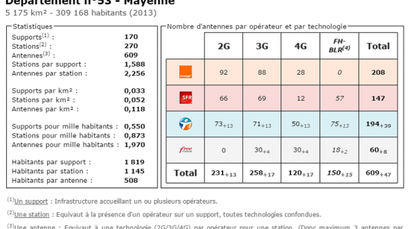 Comparatif du nombre d’antennes en Mayenne chez Free, Orange, Bouygues et SFR