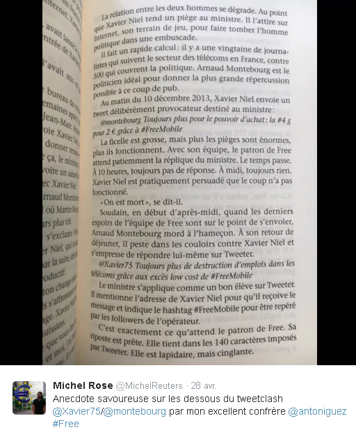Mais ce clash tweet avait en réalité été orchestré par Xavier Niel et son équipe, et Arnaud Montebourg est tombé dans le panneau. Ce sont les coulisses de cette histoire que raconte le journaliste Antonio Rodriguez dans son livre sur Montebourg