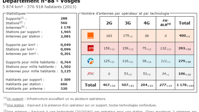 Univers Freebox vous propose, via le site Couverture Mobile, un tableau comparatif du nombre d’antennes déployées dans les Vosges, par les différents opérateurs.