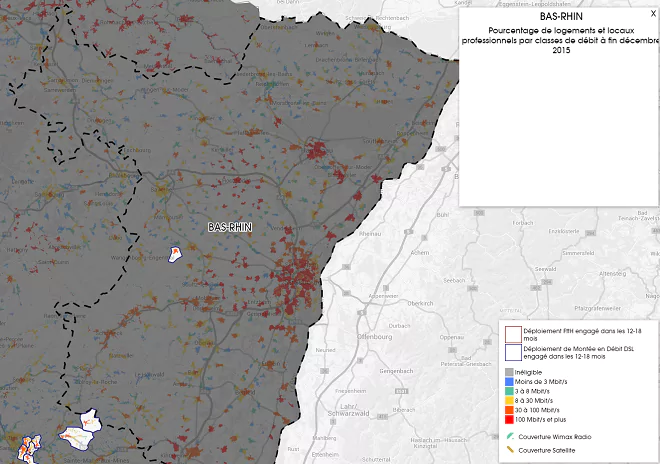 Un seul déploiement est actuellement engagé dans les 12-18 mois pour le département du Bas-Rhin. Ce déploiement concerne uniquement une montée en débit DSL.