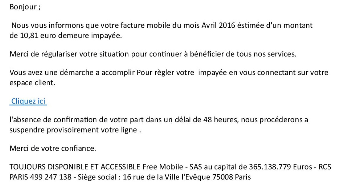 Ce mail frauduleux est une tentative de récupération de vos données bancaires. Free dispose déjà de vos coordonnées bancaires et n’aurait pas besoin de vous les redemander, ces derniers étant renseignés lors de l’inscription.