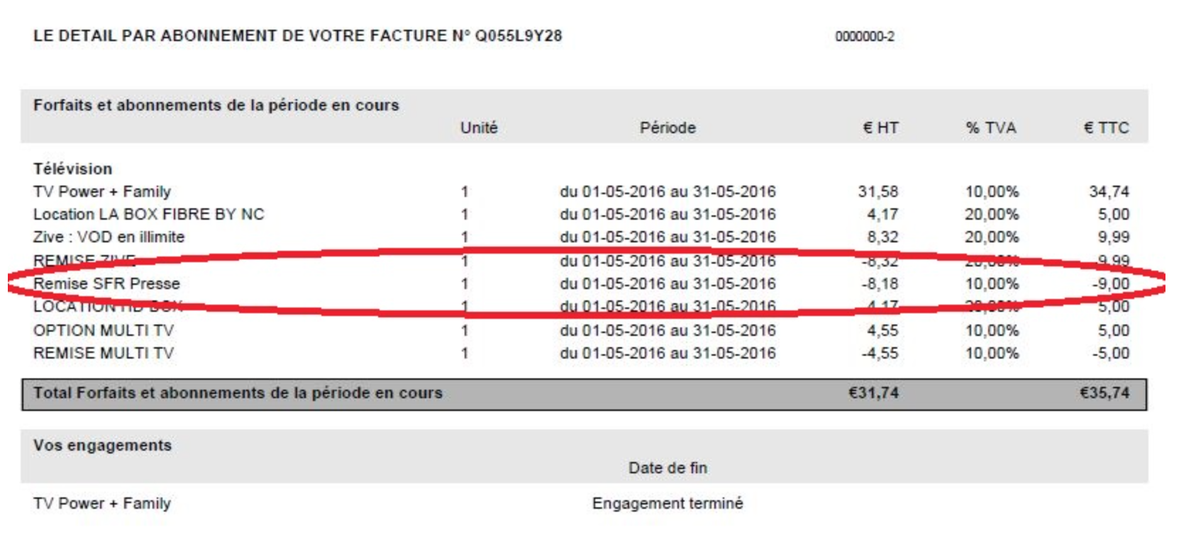 Numéricable explique que : "Vous verrez également apparaître sur votre facture plusieurs lignes de remise correspondant au montant facturé pour cette option. Votre facture comportera une ligne de remise sur la partie TV, deux lignes de remise pour la partie NET/TEL".