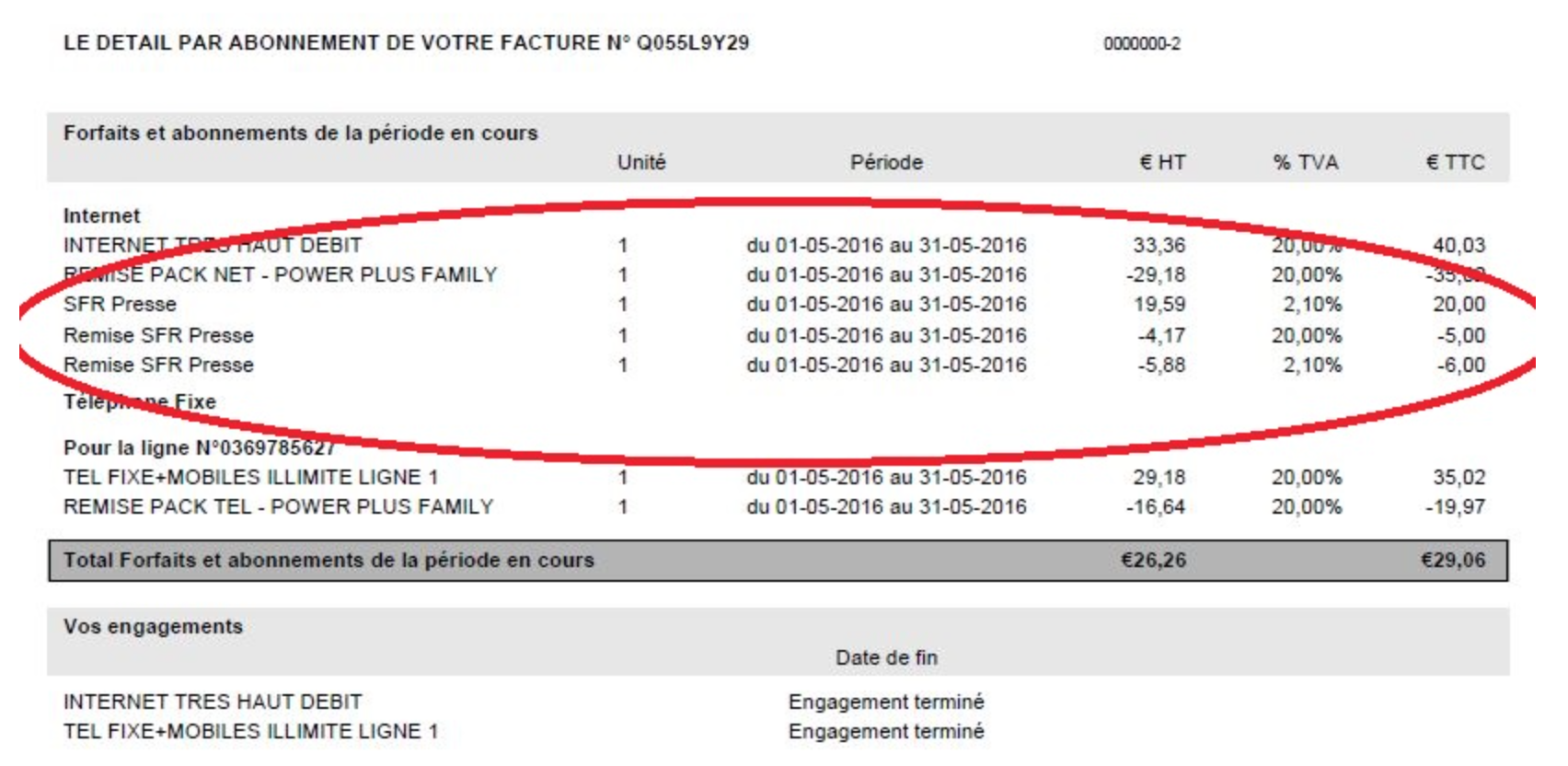 L’option SFR Presse est donc facturée 19,99€ par mois mais elle est en réalité gratuite pour une bonne partie des clients. Car une remise d’un montant équivalent est appliquée. Le taux de TVA de l’option est celui de la presse (2,1%) et celui de la remise est plus élevée en partie.