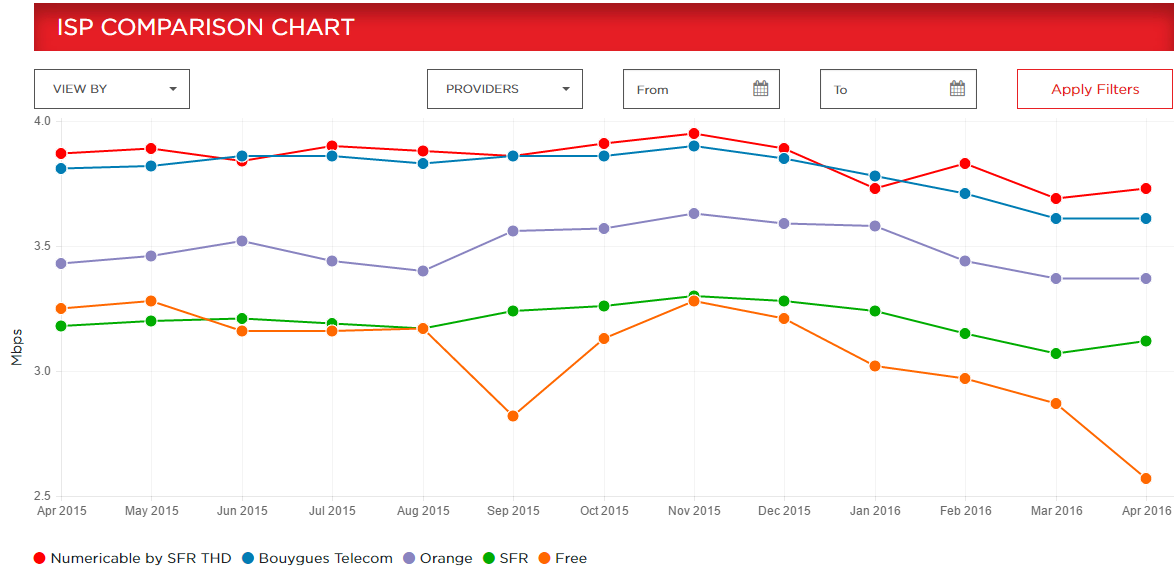 Comme chaque mois, Netflix publie son ISP Speed Index, qui mesure la vitesse moyenne de ses flux selon les pays et les opérateurs. Et durant le mois d’avril, tous les opérateurs ont légèrement augmenté leurs performances. Tous, sauf Free, qui accuse une forte chute et tombe à son plus bas niveau, à 2,57 Mbits/s. Le premier reste Numéricable, avec un débit moyen de 3,73 Mbits/s