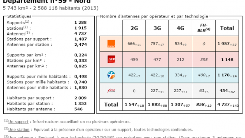 Univers Freebox vous propose, via le site Couverture Mobile, un tableau comparatif du nombre d’antennes déployées dans le Nord, par les différents opérateurs.