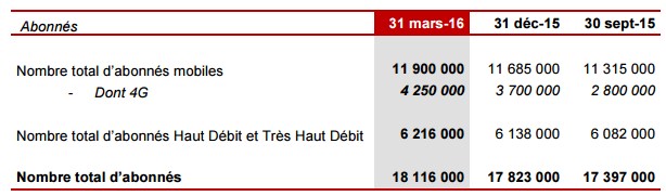Ainsi, Les activités mobiles du Groupe continuent leur forte croissance au 1er trimestre 2016, avec 215 000 abonnés recrutés (net de résiliation) sur la période. Le chiffre d’affaires affiche une hausse de plus de 10% pour atteindre 484 millions d’euros sur le trimestre.