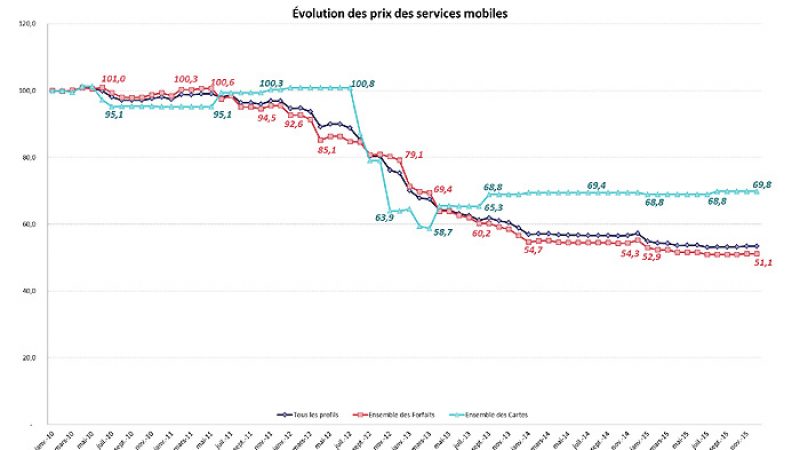 Cette diminution est due uniquement aux offres post-payées, dont les prix baissent de 5,7 % en moyenne par rapport à 2014, tandis que les prix des offres prépayées sont quasiment stables en 2015 (-0,2 %). L’absence d’évolution tarifaire importante sur le marché des cartes prépayées explique la stabilité de l’indice de prix de ces offres.