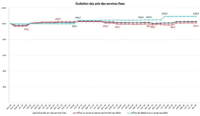 Cette stabilité en moyenne annuelle masque une augmentation des prix de 2,5 % entre janvier et décembre 2015, due à des hausses de tarifs sur les offres avec accès à internet en très haut débit. Au global, sur la période 2012 à 2015, les prix des offres en haut et très haut débit sont stables (-0,1 % en moyenne annuelle).