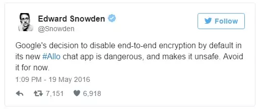 Nous vous parlions hier d’Allo, l’application de messagerie présentée par Google lors de sa conférence I/O. Dans les heures suivant son annonce, un détracteur s’est déjà manifesté, comme l’a relaté hier The Inquirer. En effet, Edward Snowden, le célèbre lanceur d’alerte, a posté un tweet dans lequel il déconseille les internautes d’utiliser Allo : « La décision de Google de désactiver le chiffrement de bout en bout par défaut dans la nouvelle application de discussion instantanée Allo est dangereuse, et la rend risquée. Évitez-la pour le moment ».