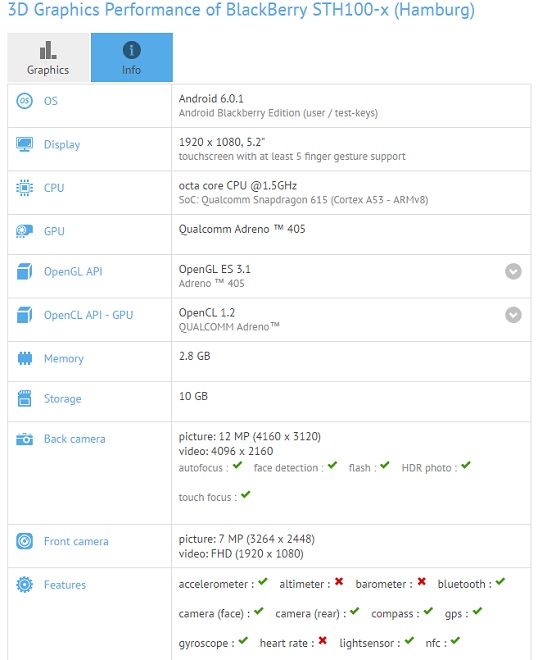01.net partage de nouvelles infos sur le prochain smartphone de Blackblerry tournant sous Android : le BlackBerry Hamburg. En effet, les caractéristiques du terminal sont mystérieusement apparus sur GFXBench. Le site spécialisé indique que « le BlackBerry Hamburg serait équipé d’un écran Full HD de 5,2 pouces et ne comporterait pas de clavier physique ». Mais on susurre sur la toile qu’il pourrait néanmoins être équipé d’un clavier coulissant à l’instar du Priv. Le terminal tournera grâce à un Snapdragon 615, sera équipé de 3Go de RAM, et comportera 16 Go de stockage.
