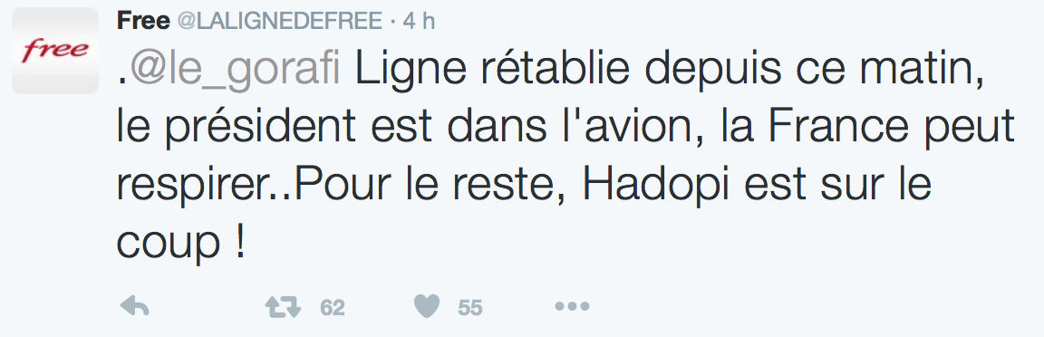 Clin d’oeil : Francois Hollande attend un technicien Free et annule un voyage officiel. Le CM Free répond avec humour
