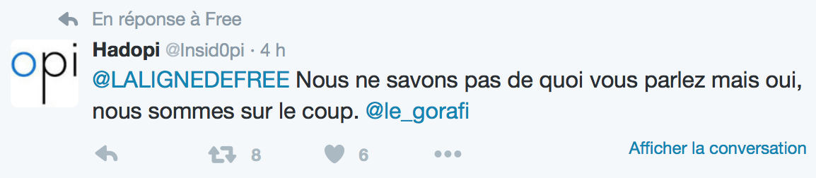 Hadopi n’a pas manqué de réagir au Tweet de Free :