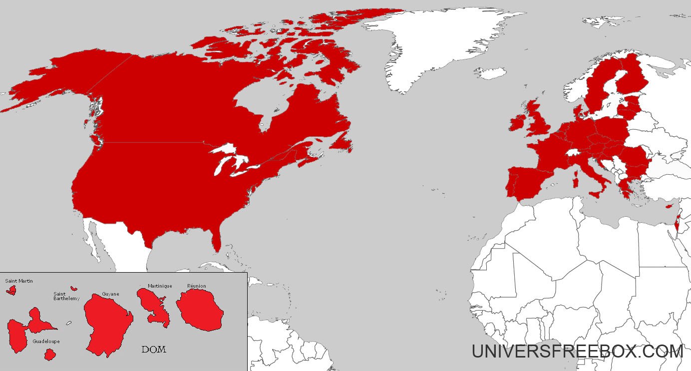 Allemagne, Antilles françaises (Guadeloupe, Martinique, Saint Barthélemy, Saint Martin)/Guyane française, Autriche, Belgique, Bulgarie, Chypre, Croatie, Danemark, Espagne, Estonie, Finlande, Grèce, Hongrie, Irlande, Italie, Lettonie, Lituanie, Luxembourg, Malte, Mayotte/La Réunion (MMS/Internet mobile non disponible à Mayotte), Pays-Bas, Pologne, Portugal, République Tchèque, Roumanie, Royaume-Uni, Slovaquie, Slovénie, Suède, Gibraltar, Israël, Canada et les Etats Unis.