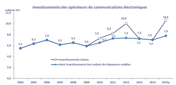 Les opérateurs ont investi environ 2,3 milliards d’euros pour leur activité mobile, dont 1,2 milliard d’euros dans les boucles locales 3G et 4G, soit une progression supérieure à 15% en 2015, alors que le niveau investi était pratiquement stable en 2014, à un milliard d’euros