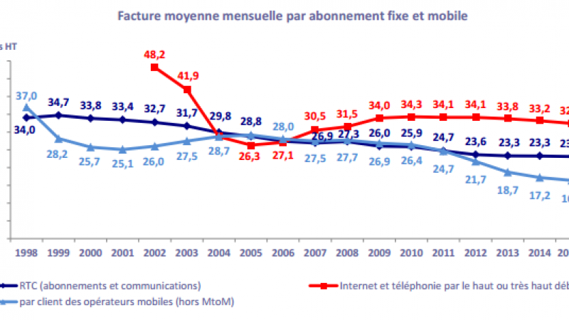 Selon les chiffres que vient de publier l’ARCEP dans son observatoire pour 2015, le montant de la facture moyenne hors taxes des clients des opérateurs mobiles, calculée hors cartes MtoM, diminue depuis 2008 en lien avec l’accroissement du nombre de cartes SIM et la diminution du revenu consécutive aux baisses de prix sur le marché. Elle a perdu 10 euros en cinq ans (soit 16,4 euros hors taxes en 2015), mais seulement 80 centimes en 2015 et 1,5 euro en 2014 contre -3,0 euros en 2013 et en 2012.