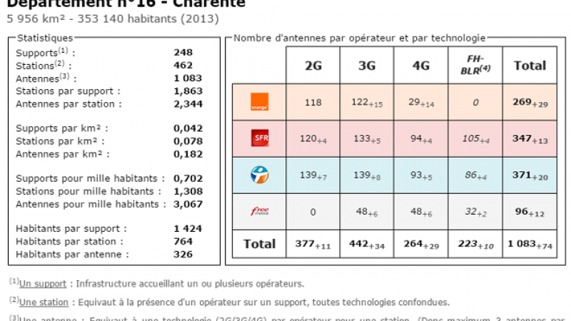 Univers Freebox vous propose, via le site Couverture Mobile, un tableau comparatif du nombre d’antennes déployées dans la Charente, par les différents opérateurs.