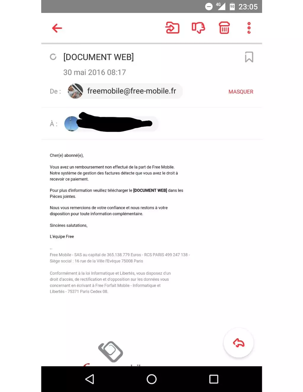 C’est sur Twitter (@blazou81) qu’un internaute met en garde les Freenaute sur le phishing qu’il vient de recevoir. Un phishing classique permettant un remboursement de la part de Free Mobile en cliquant sur un lien (il ne fait pas cliquer !) mais cette fois ci l’adresse mail d’envoi est freemobile@free-mobile.fr.