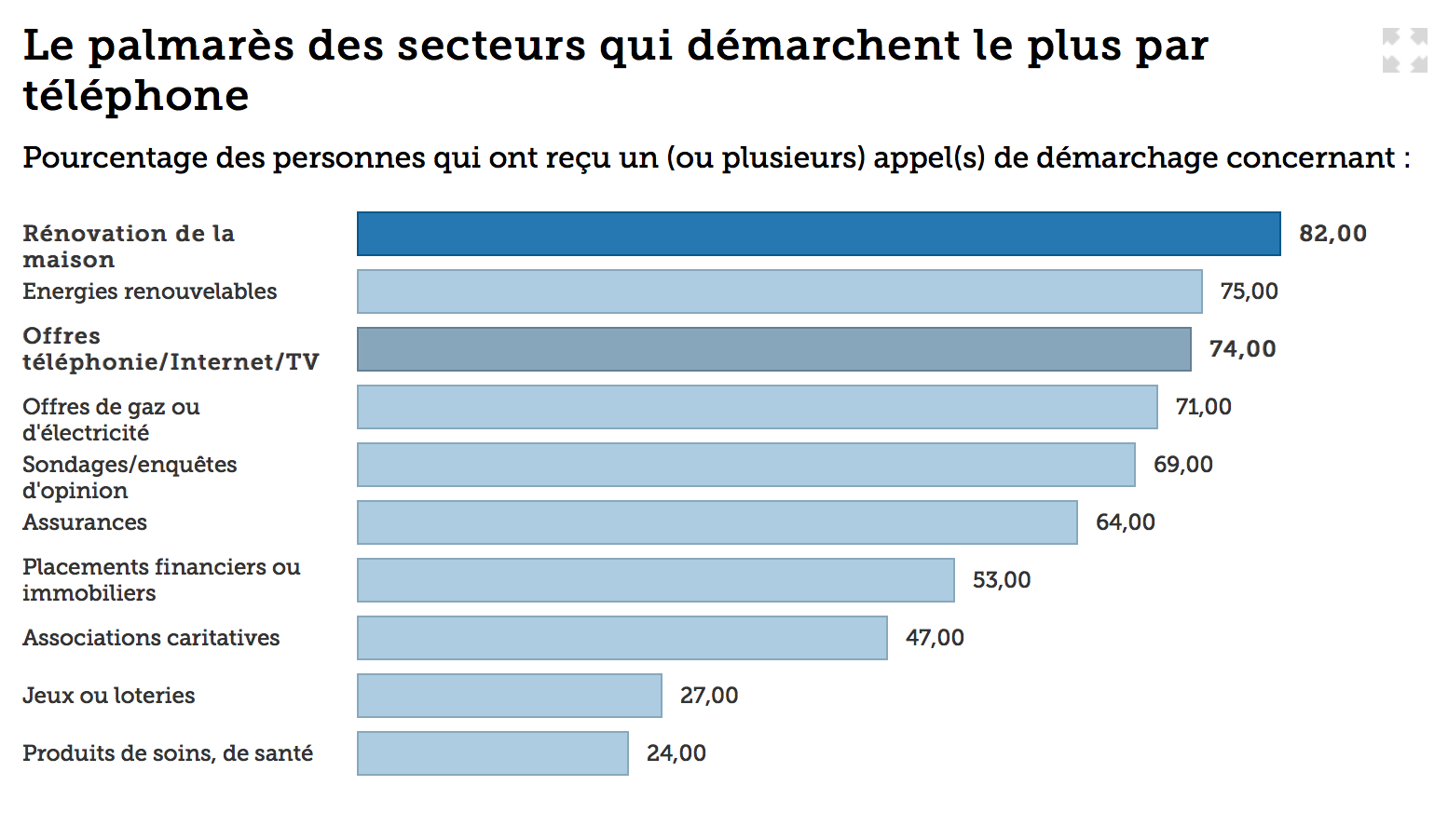 Le Figaro a mis en ligne un graphique permettant de voir quels sont les secteurs d’activités qui démarchent le plus : la téléphonie mobile et internet arrive en 3ème position avec 74% des personnes qui indiquent avoir reçu un ou plusieurs démarchages.
