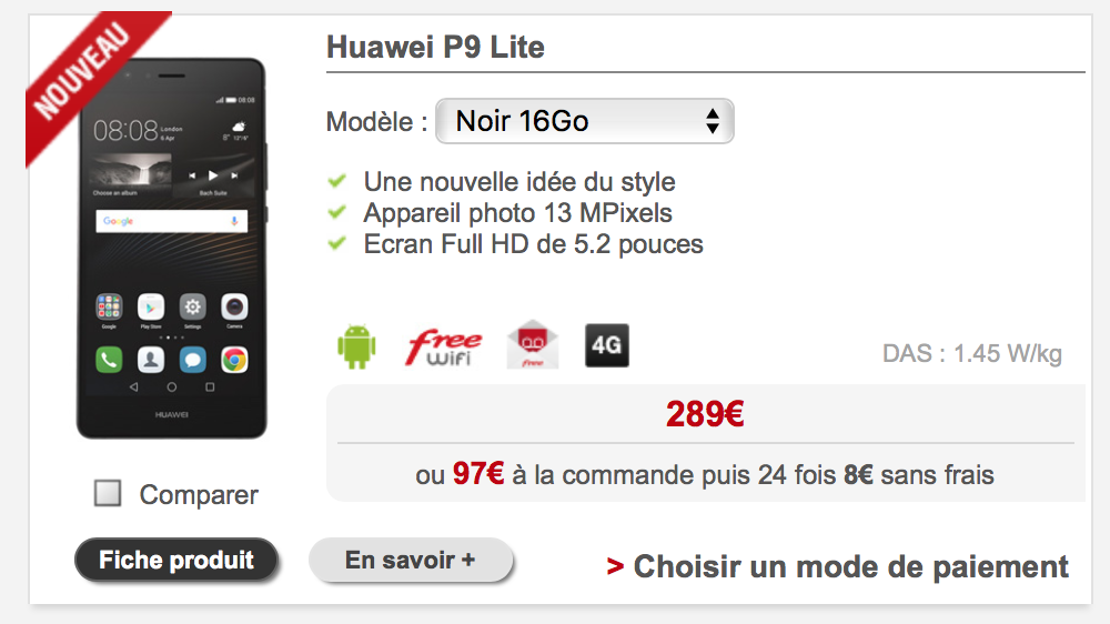 Le Huawey P9 Lite est proposé à 289€ en paiement comptant, à 73€ à la commande puis 72€ sur 3 mois (paiement en 4 fois), ou encore à 97€ a la commande et 8€ sur 24 mois (paiement en 24 fois). Il est proposé en version 16 GO en version noir ou blanc.