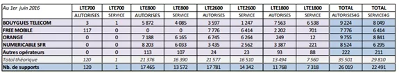 L’ANFR vient de publier les chiffres de déploiement des réseaux mobiles au 1er juin 2016. A cette date, 26 019 sites sont autorisés, dont 22 491 en service, pour la téléphonie mobile très haut débit (4G) tous opérateurs confondus.