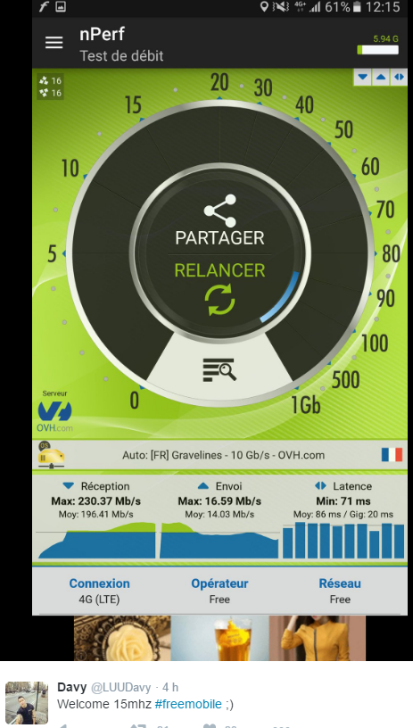 Ainsi que nous vous le rapportions, ces nouvelles fréquences permettent à Free de proposer un débit max théorique supérieur, qui passe de 150 Mbits/s (voire 187,5 Mbits/s) maximum à 262,5 Mbits/maximum. Et grâce à l’utilisation de ces nouvelles fréquences les résultats ne se sont pas fait attendre. En effet, @LUUDavy vient de réaliser un test de débit sur le réseau de Free Mobile à 230,37 Mbits/s en réception, ce qui en fait de loin le nouveau record.