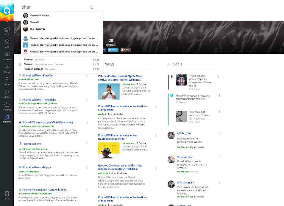 La recherche d’un artiste offre une vue globale sur ses dernières actualités, ses prochains concerts, ses collaborations, ses vidéos, ses contenus sur les réseaux sociaux, sa biographie, qu’il soit une grande star, un jeune espoir ou un indépendant. Qwant Music s’associe avec Radioline pour intégrer l’accès aux radios ; avec BandSquare, pour l’actualité de promotion de concerts ; et avec avec iMusic-school, pour les cours de musique relatifs aux œuvres recherchées. Qwant Music s’est ouvert en beta le 03 juin.