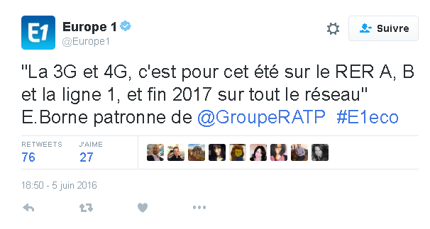 Elisabeth Borne, la Présidente-directrice générale de la RATP, était invitée ce week end sur Europe 1. Et elle a fait une annonce qui devrait réjouir tous les franciliens. Elisabeth Borne a assuré que la 3G et la 4G, seront disponibles sur les RER A, B et la ligne 1 du métro. Et l’objectif est de couvrir tout le réseau en 3G/4G pour la fin 2017, dans les stations et également dans les trains.