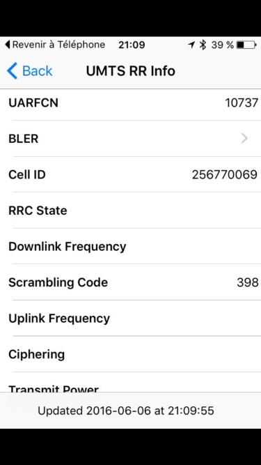 Pour aller plus loin et pour connaître sur quelle antenne est connecté l’iPhone, il faut retourner au menu principal. Il faut se rendre dans UMTS Cell Environment puis UMTS RR Info. L’information à retenir est le Cell ID. Dans l’exemple de RNC mobile, il s’agit du n° 256770069. Ce numéro nous permet sur le site de RNCMobile de retrouver l’antenne correspondante.