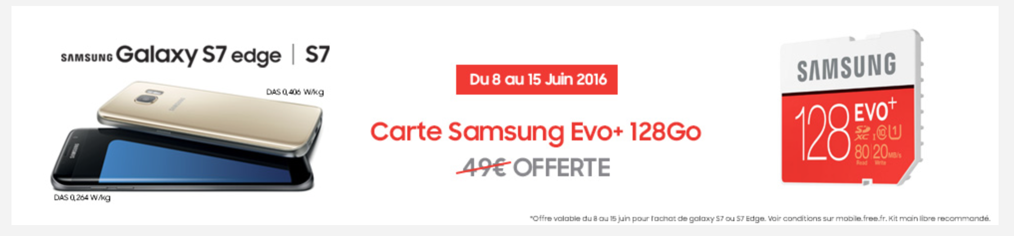 Free Mobile propose une offre spéciale dans sa boutique en ligne pour tout achat d’un Samsung Galaxy S7 ou un Galaxy S7 Edge. Du 8 au 15 juin, pour tout achat d’un de ces smartphones, une Carte Samsung Evo+ 128 GO (d’une valeur de 49€) est offerte.