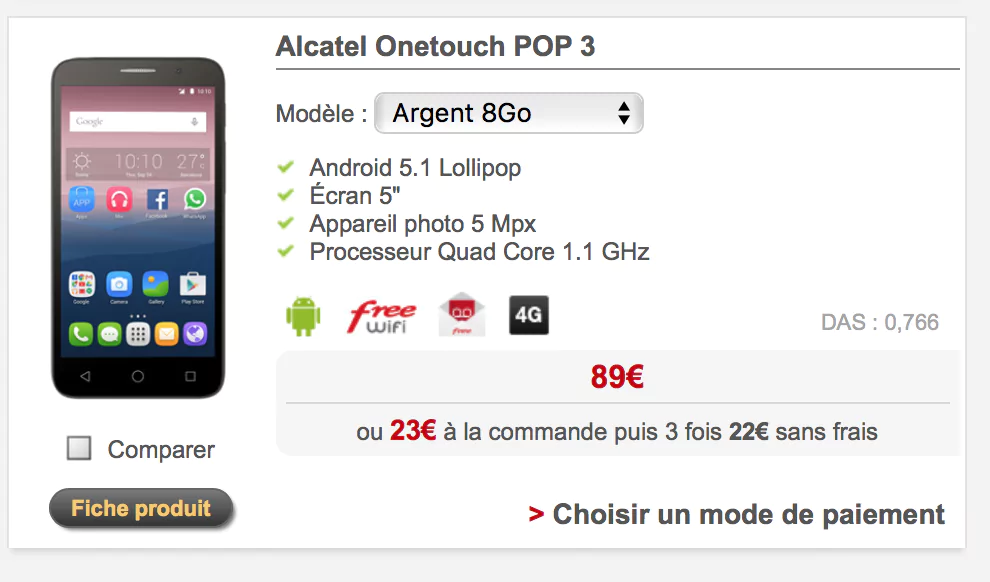L’Alcatel est disponible en version 8 GO, couleur argent, et il est possible de le payer en 4 fois sans frais : 23€ à la commande puis 22€ sur trois mois.