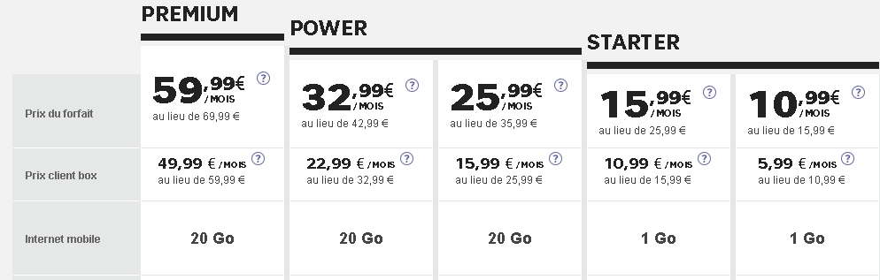 Concernant les tarifs, une réduction de 5 à 10 euros est proposée durant la première année. Le prix des forfaits débutent avec la formule Starter à 10,99€ (5,99€ la première année) pour 2h d’appels et 100 Mo (cette offre n’apparaît pas sur le tableau des tarifs). Pour le forfait haut de gamme, nommé « premium », le tarif monte jusqu’à 69,99€ (59,99€ la première année) pour les appels illimités, 20Go de data et le roaming aux USA et en Europe toute l’année. A noter que tous ces forfaits sont soumis à un engagement d’un an.