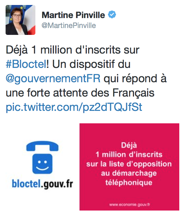Bloctel, la nouvelle liste anti-démarchage mis en place par le gouvernement depuis le 1er juin, rencontre un succès. Martine Pinville, la Secrétaire d’État chargée du Commerce, de l’Artisanat, de la Consommation et de l’Économie Sociale et Solidaire, annonce sur son compte Twitter que Bloctel a déjà enregistré 1 million d’inscrit.