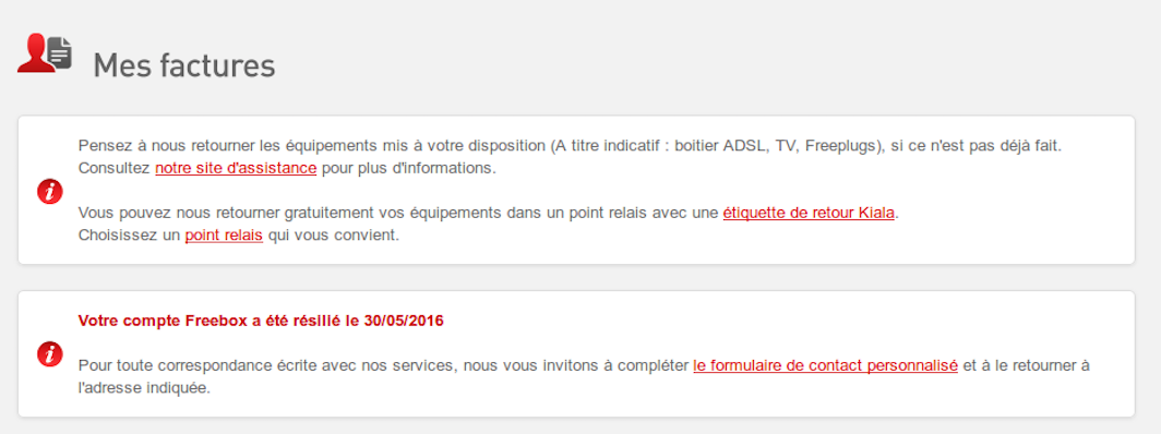 Depuis octobre 2015, il est désormais possible de résilier sans formulaire lorsqu’un abonné fait une portabilité de son numéro fixe vers un autre opérateur. Cela engendre la résiliation automatique de l’abonnement Freebox (sur le même principe que les mobiles, avec le RIO). Il ne reste plus qu’à renvoyer le matériel. Free facilite désormais ce renvoi puisque dans l’Interface de Gestion qui mentionne que le compte est résilié, Free met à disposition automatiquement une étiquette de retour via KIALA. Il suffit de l’imprimer et de déposer son matériel dans un point du réseau Kiala.