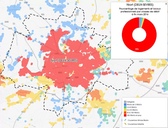 95% des logements et locaux professionnels de la ville de Niort ont accès au Très Haut Débit, avec un débit dépassant les 100Mbits/s.