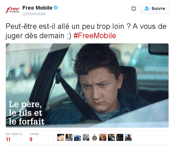 C’est un drôle de tweet que viennent de poster les comptes Twitter de Free et Free Mobile. Il s’agit d’une devinette : « Peut-être est-il allé un peu trop loin ? ». Celle-ci est accompagnée d’une photo, avec pour légende, "le père, le fils et le forfait". Il est également précisé que cela concernera Free Mobile.