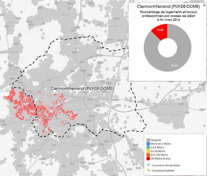On peut voir sur la première carte que près de 93% de la ville de Clermont-Ferrand peut atteindre des débits dépassant les 100 Mbis/s.