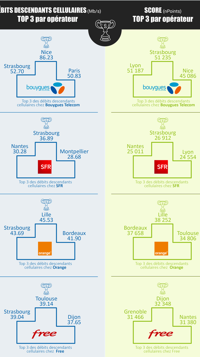 L’application nPerf, qui teste la qualité des connexions fixes et mobiles, a recueilli plus de deux millions de tests mobiles en France en 2015. Grâce aux données mobiles récoltées sur l’année 2015, nPerf a pu élaborer un classement des villes de plus de 150 000 habitants : Angers, Bordeaux, Dijon, Grenoble, Le Havre, Lille, Lyon, Marseille, Montpellier, Nantes, Nice, Paris, Reims, Rennes, Saint-Étienne, Strasbourg, Toulon et Toulouse.