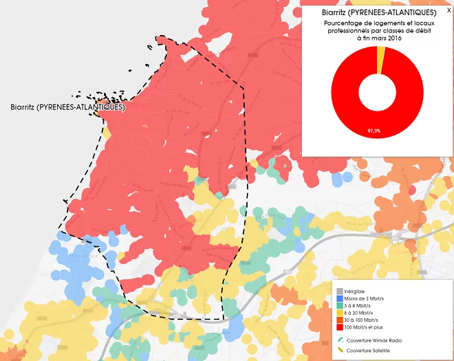 On voit sur la carte des déploiements ADSL, Câbles et FTTH que plus de 97% des logements et locaux professionnels de la ville de Biarritz peuvent atteindre un débit dépassant les 100 Mbits/s.