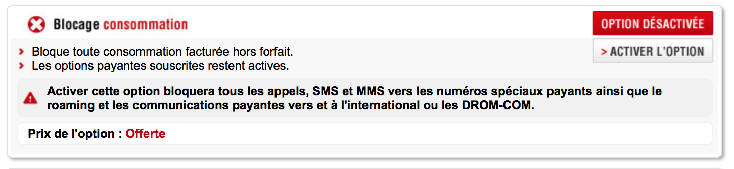 Pour les plus craintifs, il est également possible de mettre en place l’option Blocage Consommation, qui est une option gratuite et activable sur l’Espace Abonné. Cette option permet de bloquer tout le hors forfait y compris le roaming (mais attention, cela bloquera également les appels, sms, mms et data gratuite qui pourraient être inclus). Une fois les 3 Go consommés il est aussi envisageable de couper l’itinérance des données directement sur le téléphone de façon à n’avoir aucune connexion intempestive.