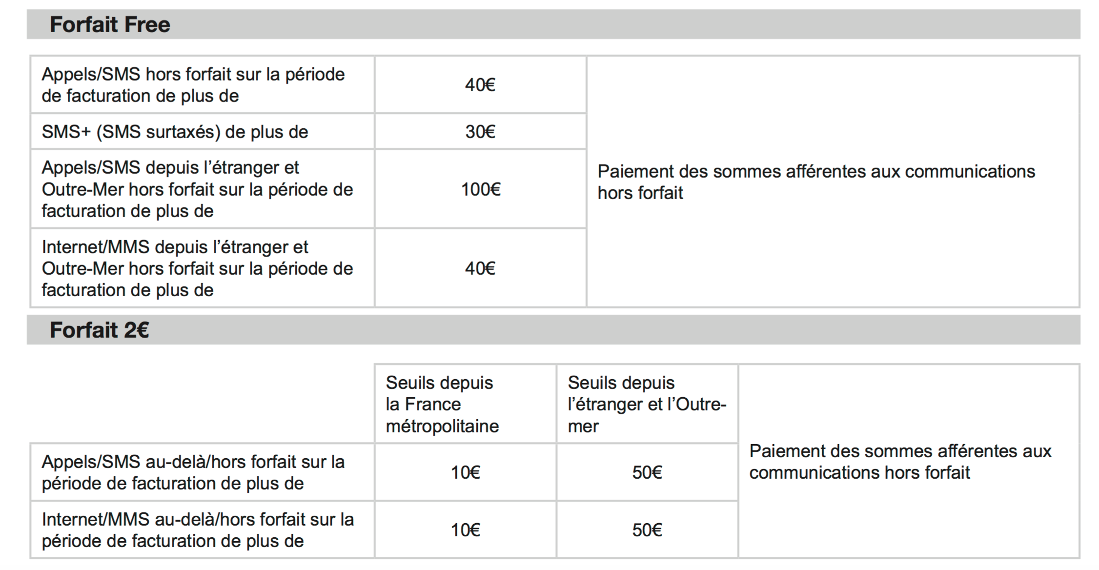 Sur le même principe que le forfait illimité, en cas d’utilisation d’internet, un blocage se met en place dès 50 euro de dépassement. A noter que des restrictions s’appliquent aussi sur les appels et SMS quand un abonné arrive à 100 euros de hors forfait sur les appels/SMS pour le forfait illimité et 50€ pour le forfait 2€.