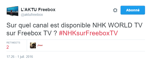 Le compte Twitter de l’Aktu Freebox propose un jeu concours sur Twitter, qui permet de remporter des invitations à la Japan Expo 2016, qui aura lieu au Parc des expositions de Paris-Nord Villepinte du 7 au 10 juillet. Pour participer, il faut répondre sur Twitter à la question suivante « Sur quel canal est disponible NHK WORLD TV sur Freebox TV ? » avec le #NHKsurFreeboxTV.