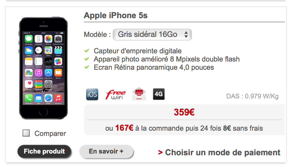 L’iPhone 5s offre la possibilité de le payer en 4 fois sans frais (92€ à la commande puis 89€ sur 3 mois) ou en 24 fois sans frais (167€ à la commande puis 8€ sur 24 mois). C’est d’ailleurs le seul iPhone avec une facilité de paiement en 24 fois sans frais, puisque les autres modèles sont proposés en 4 fois sans frais ou formule de location.