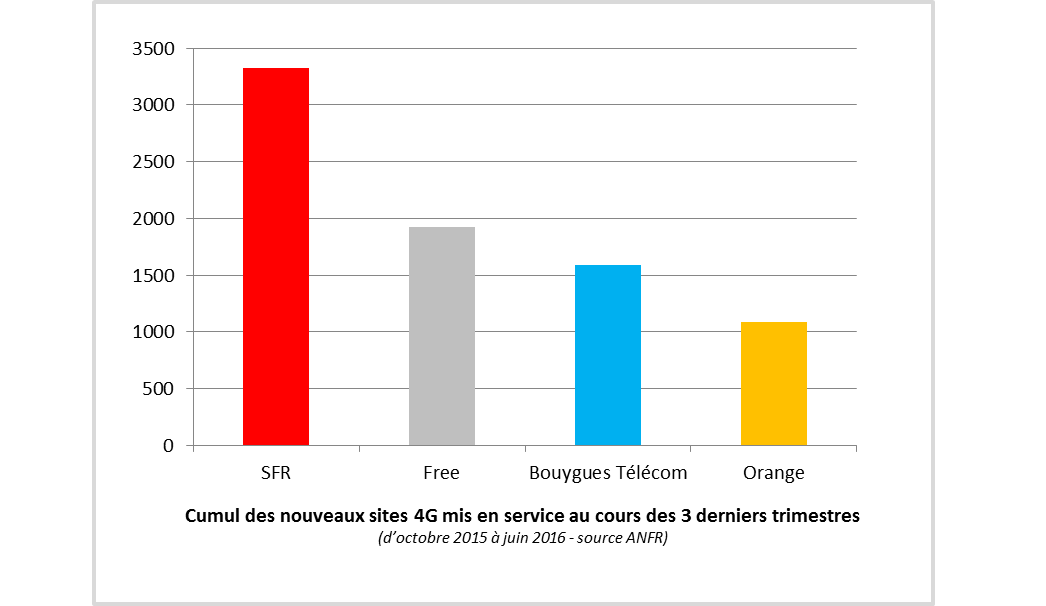 Pour capitaliser sur ce succès, l’opérateur au Carré Rouge vient de publier le classement des opérateurs qui ont le plus déployé la 4G au cours des 3 derniers trimestres. Comme on peut le constater sur le graph ci-dessous, SFR est très largement en tête. Entre octobre 2015 et juin 2016, il a ouvert 3 321 nouveaux sites 4G, augmentant de près de 80% la taille de son parc de sites 4G en service.