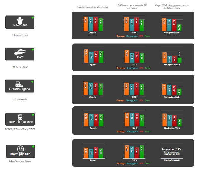 Orange affiche les meilleurs résultats sur l’ensemble de l’enquête. Bouygues Telecom et SFR affichent des performances assez proches l’un de l’autre, toutefois moins bonnes que celles de l’opérateur historique. La hiérarchie entre les deux opérateurs dépend des usages considérés. Enfin, Free Mobile obtient des résultats sensiblement moins bons sur un grand nombre d’indicateurs, en ce qui concerne la navigation web et les vidéos.