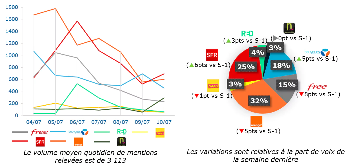 Webhelp a publié publie son « baromètre des télécoms hebdomadaire, qui collecte les données automatiquement sur un corpus de plus de 600 000 000 sites, blogs, forums, profils Facebook et Twitter. Durant la période étudiée, Free a moins fait parler de lui, même s’il a annoncé avoir inclus de nouvelles destinations téléphoniques dans son offre Freebox (le mardi 5 juillet). A contrario, c’est SFR qui progresse le plus, mais pas forcement que pour de bonnes raisons. En effet SFR fait l’objet d’une condamnation pour son non-respect des accords de maintien dans l’emploi de ses ex-salariés, et c’est cette information qui a été le plus reprise.