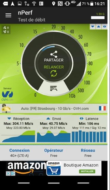 Free Mobile vient d’enregistrer son nouveau record en 4G à Tarbes, grâce aux fréquences 700 MHz. Résultat : nPerf affiche un débit descendant maximal de 304,11 Mb/s et un débit montant maximal de 40,75 Mb/s. Ces débits ont été mesurés avec l’application de mesure nPerf en situation réelle, avec un Sony Xperia xPerformance. Il s’agit d’un mobile de catégorie 9 qui est capable de faire de la 4G en même temps en 700 Mhz + 1800 Mhz + 2600 Mhz