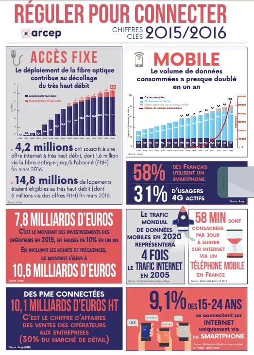 L’ARCEP vient de publier une infographie qui reprend tous les chiffres des télécoms, que ce soit ceux concernant la fibre, le mobile, les investissements ou encore les usages.