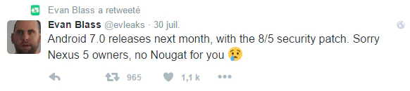 En effet Evan Blass, connu pour être un habitué des leaks concernant les smartphones, a annoncé samedi dans un de ses tweets qu’Android 7.0 devrait faire son apparition ce vendredi 5 août en même temps que la mise à jour de sécurité déployé par Google.