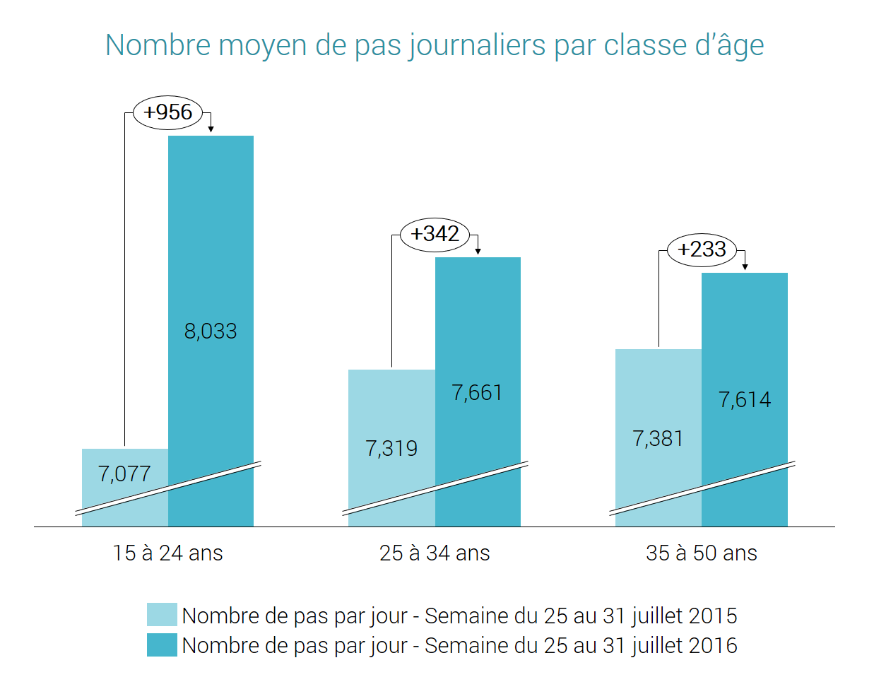 Comme le jeu repose sur la marche à pied en vue de trouver – et capturer – les fameux Pokémons, Withings, a voulu regarder si une augmentation du nombre moyen de pas pouvait être constatée. Les équipes de Withings, ont comparé le nombre moyen de pas par jour pendant la semaine du 25 au 31 juillet 2016 avec celui de la même période de l’année dernière (25 au 31 juillet 2015).